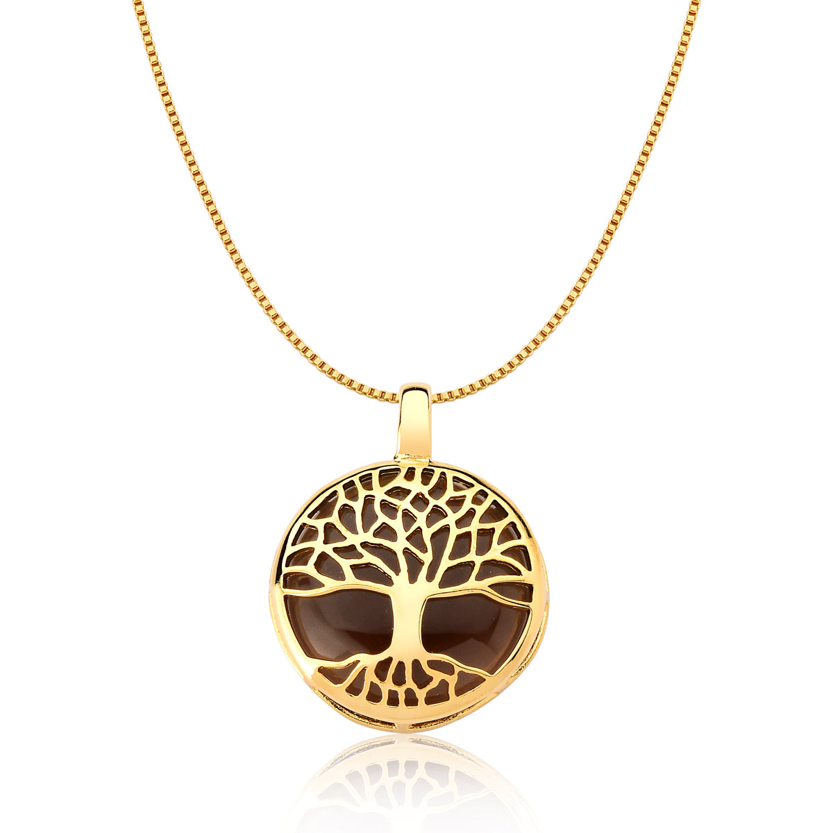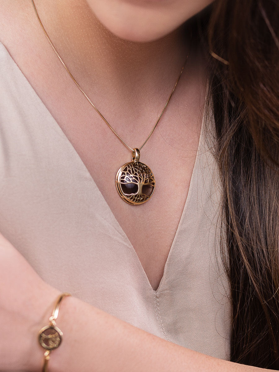 Tree of Life Pendant Necklace in Smoke Obsidian Natural Gemstone | Gold Plated