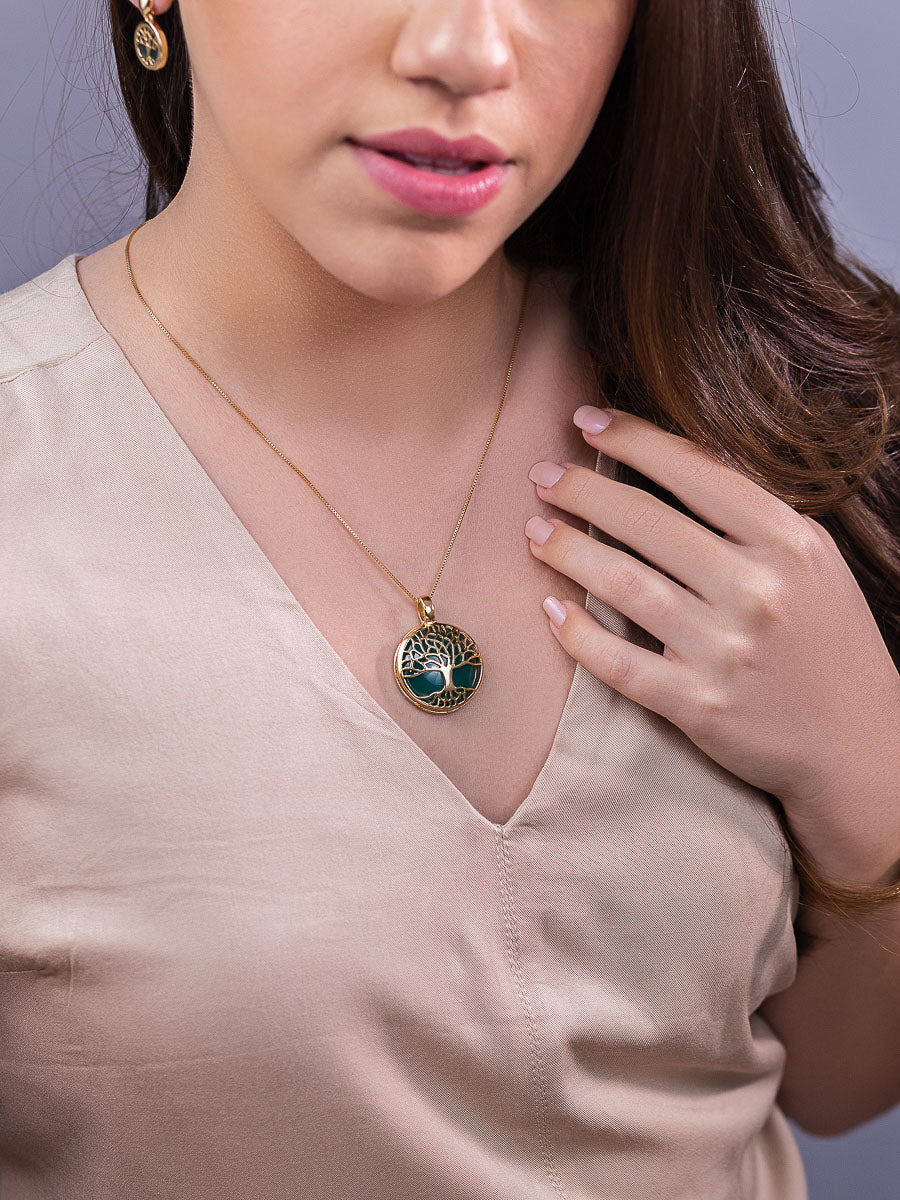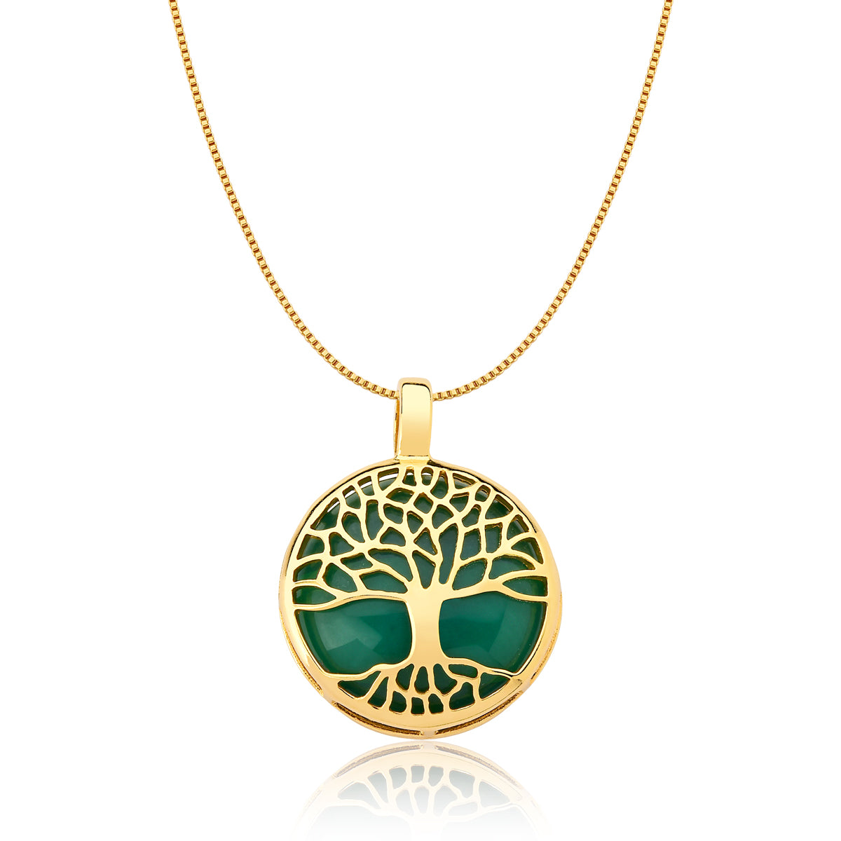 Tree of Life Pendant Necklace in Green Agate Natural Gemstone | Gold Plated