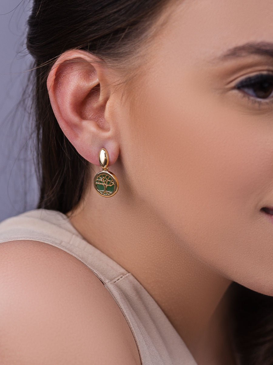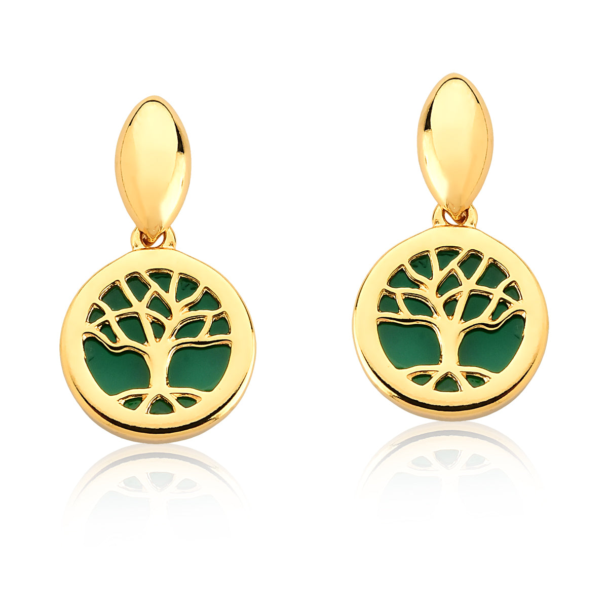 Tree of Life Drop Earrings in Green Agate Natural Gemstone | Gold Plated