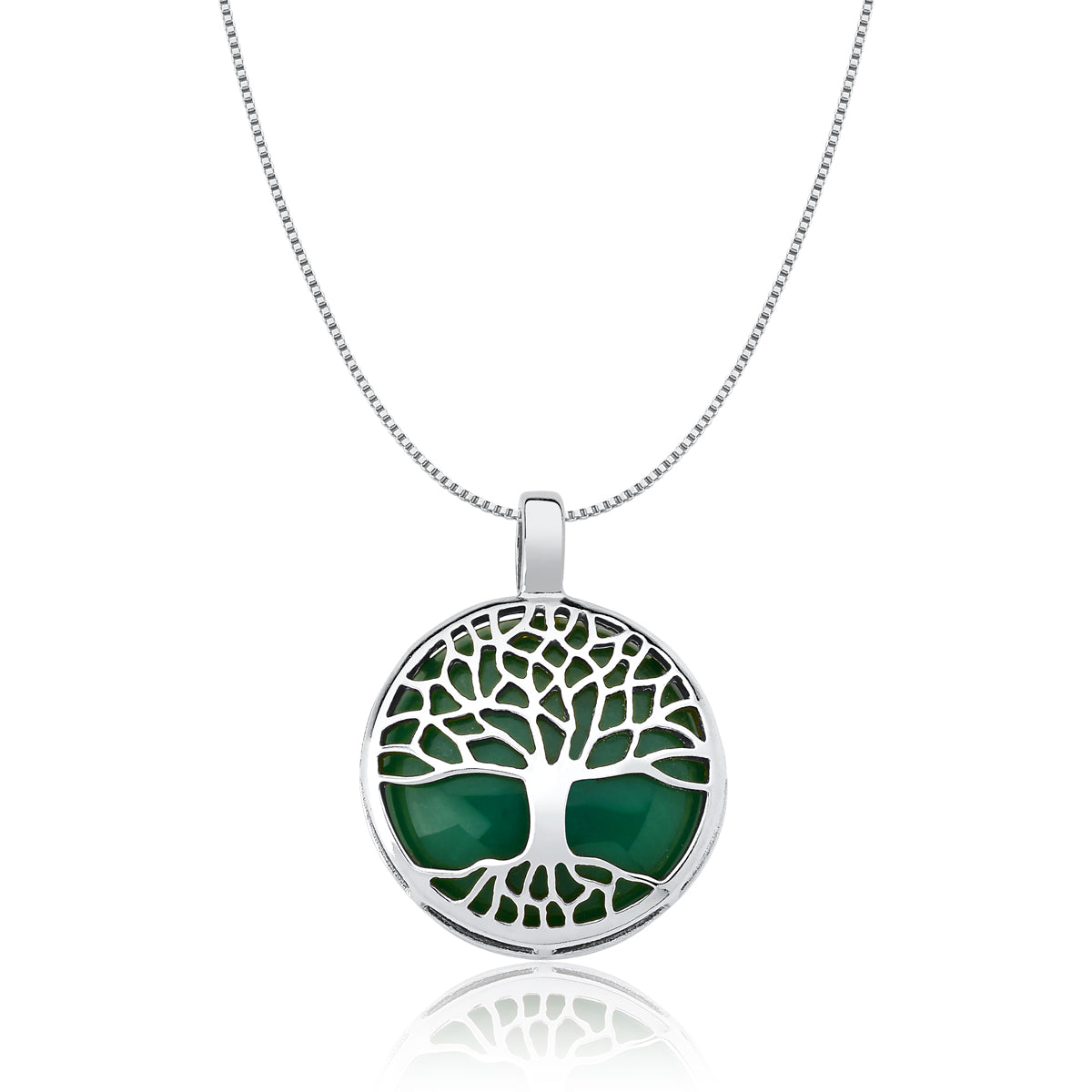 Tree of Life Pendant Necklace in Green Agate Natural Gemstone | Rhodium Plated