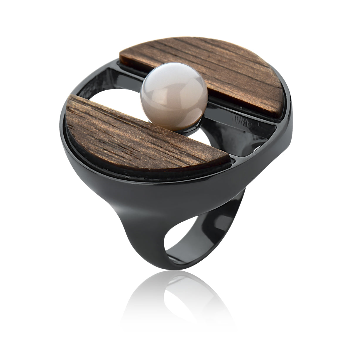 Cocktail Ring in Eucalyptus Wood and Grey Agate Natural Gemstone | Black Metal