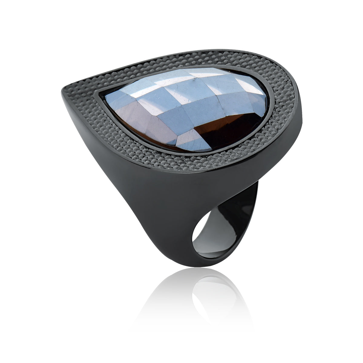 White Porcelain Cocktail Ring & Pave Black Zirconia Studded | Black Metal