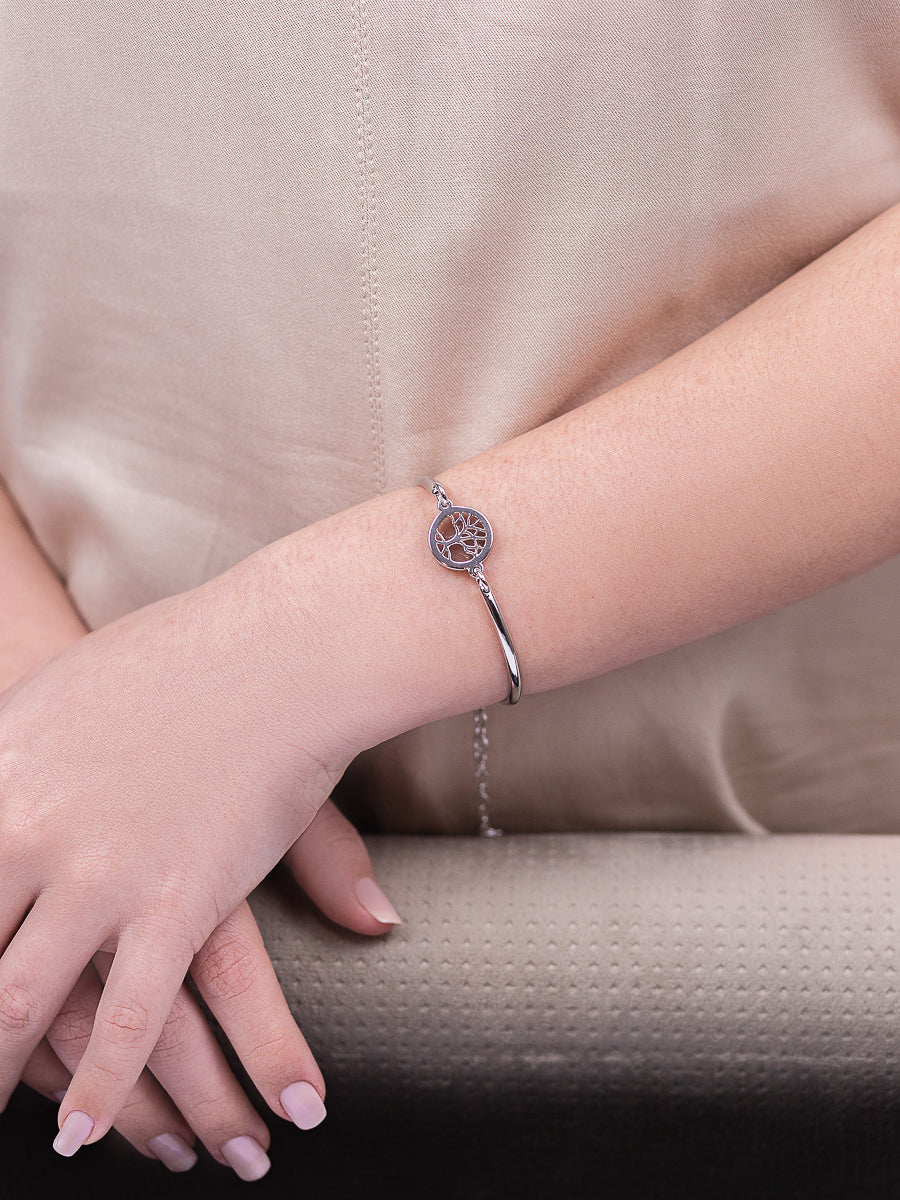 Tree of Life Bangle Bracelet in Smoke Obsidian Natural Gemstone | Rhodium Plated