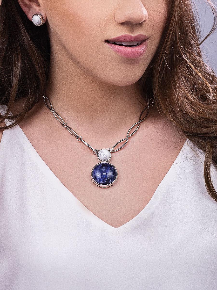 Collar Necklace in Sodalite & White Howlite Natural Gemstone | Rhodium Plated